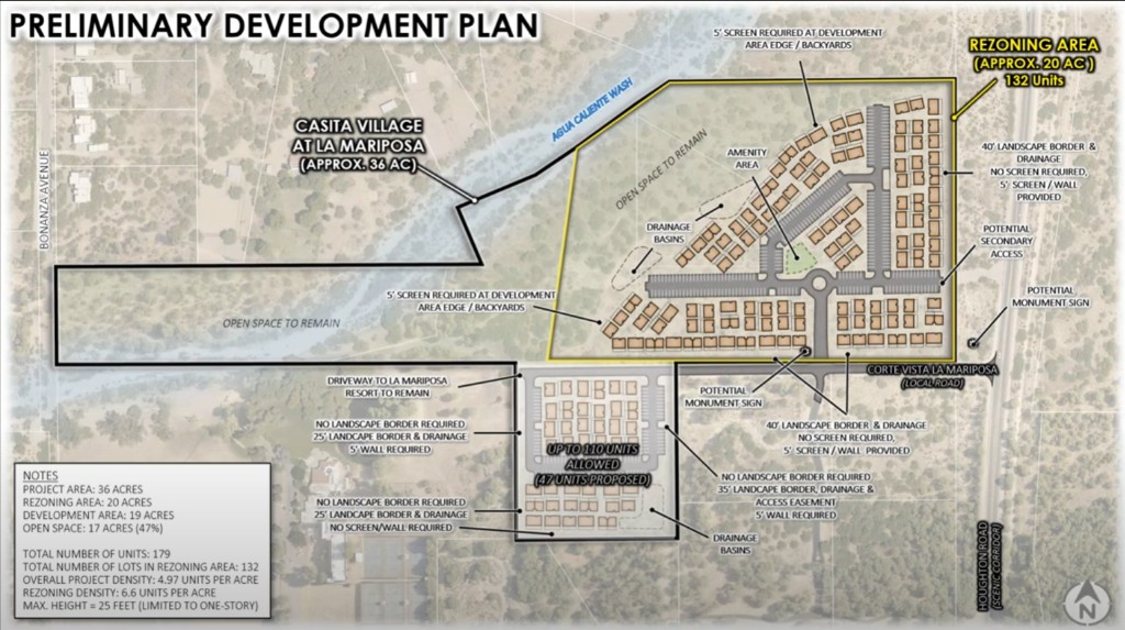 We, the residents of the City of Tucson and/or Pima County areas, urge im-mediate action to stop the rezoning and construction of 121 luxury rentals referred to as Casita Village at La Mariposa, identified as City of Tucson rezoning case C9-21-20 on Houghton Road, proposing to change zoning from SR (Suburban Ranch) to RR-2 (Rural Residential 2). The proposed development area is on the west side of Houghton Rd be-tween Tanque Verde and Speedway on the La Mariposa property near the resort.